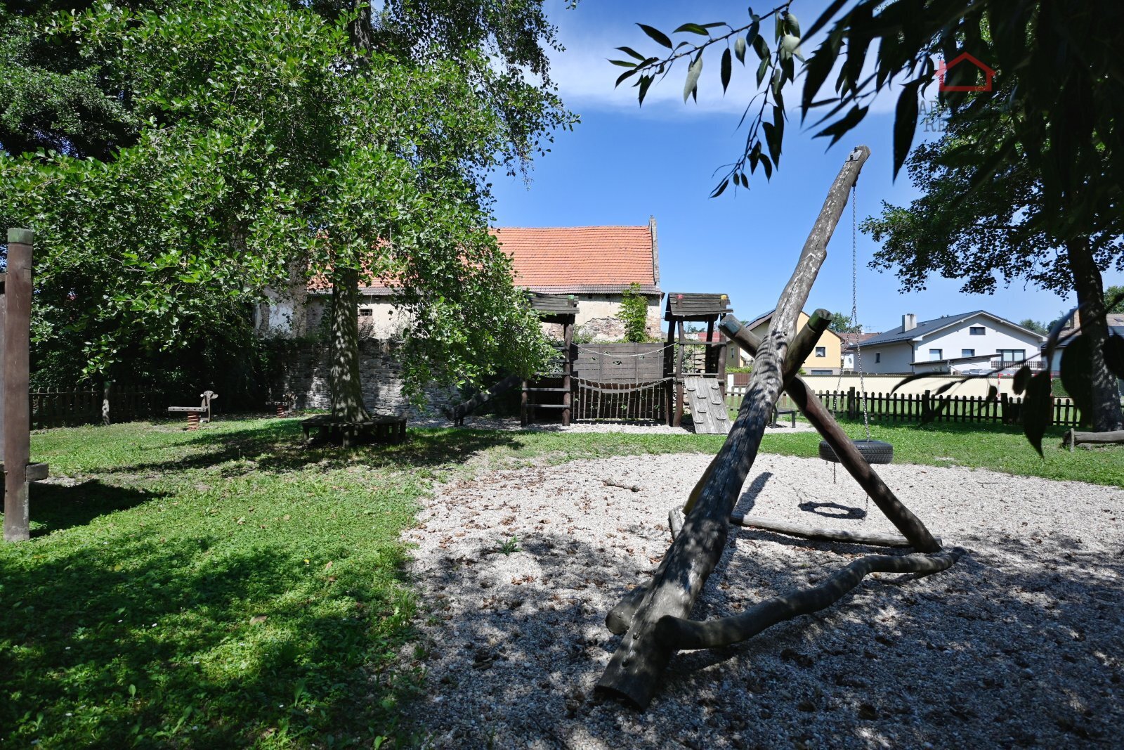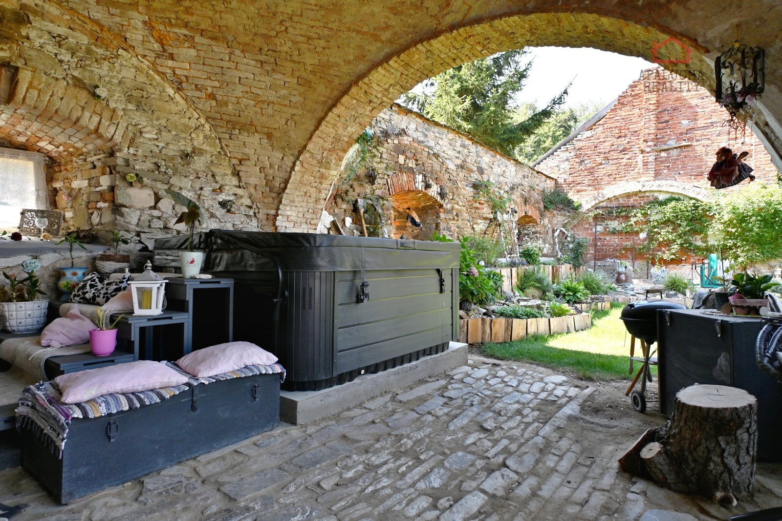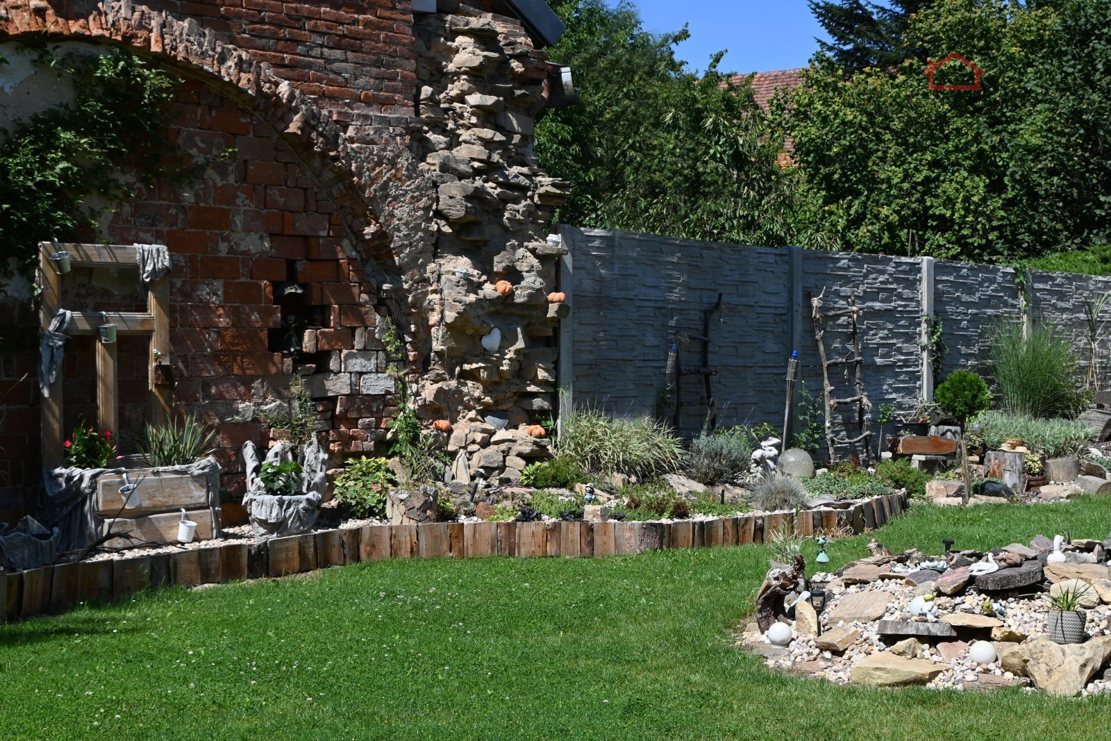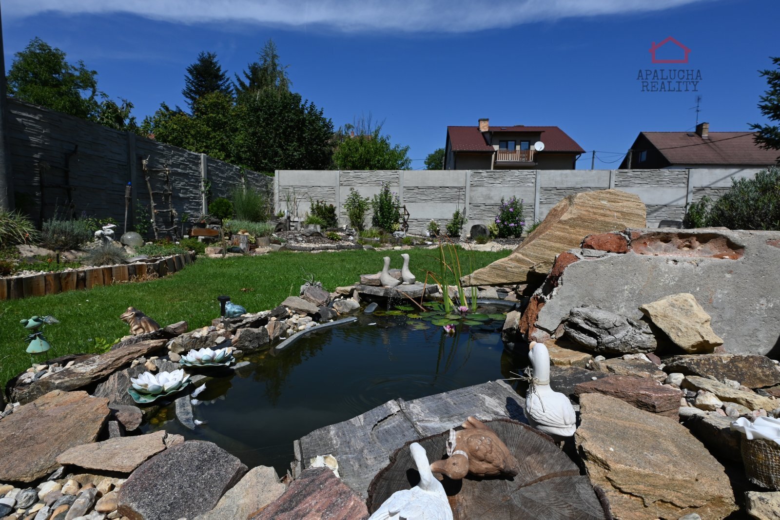 Zahrada disponuje zatravněnou částí s malým jezírkem a množstvím designových prvků, které jsou patrné z fotografií. U domu je umístěn kotec pro čtyřnohého přítele.