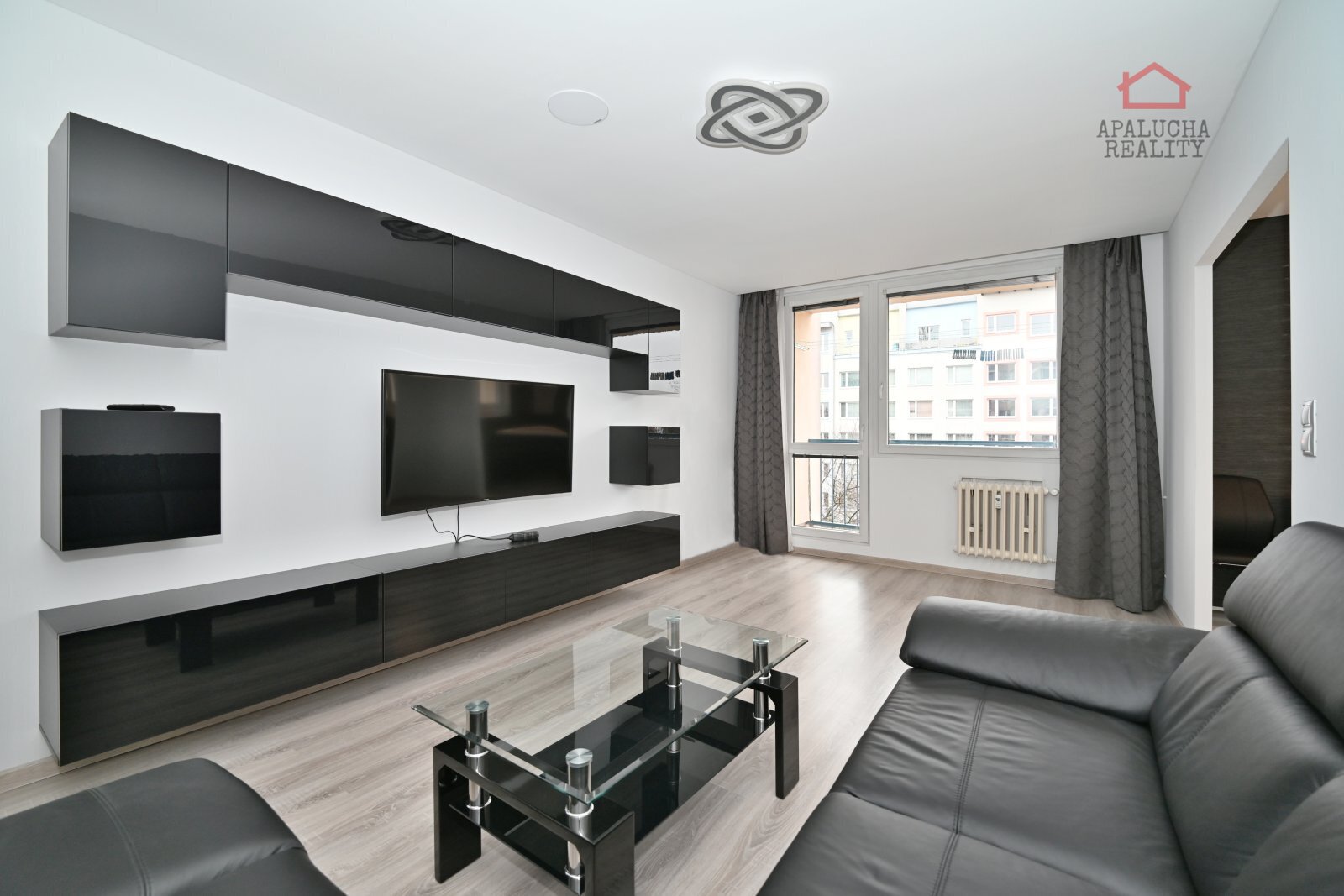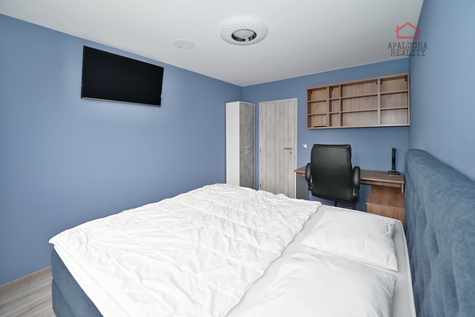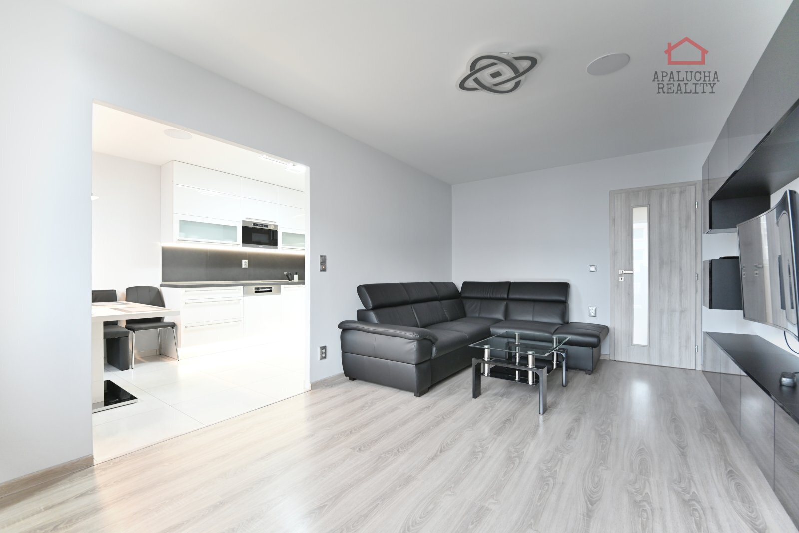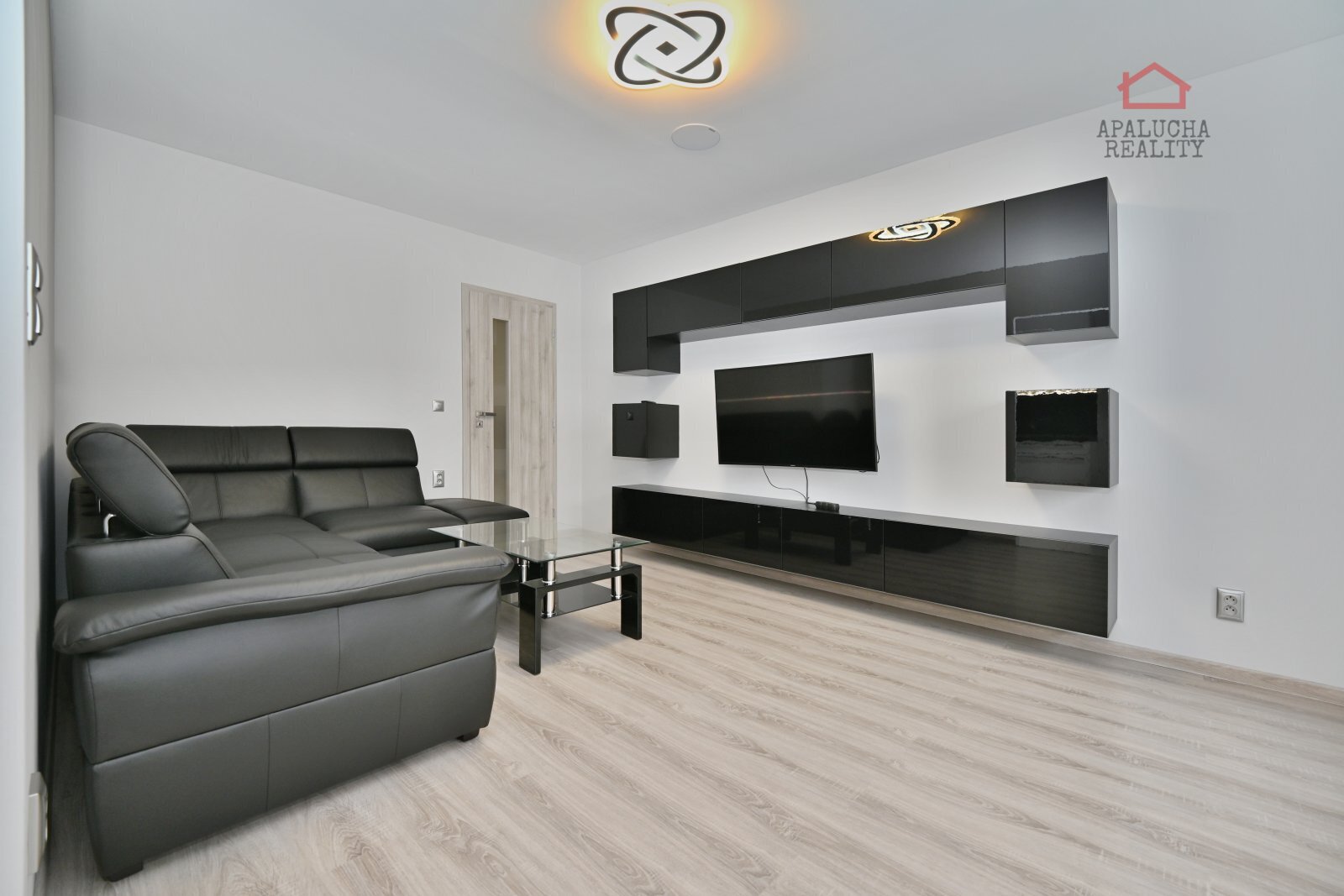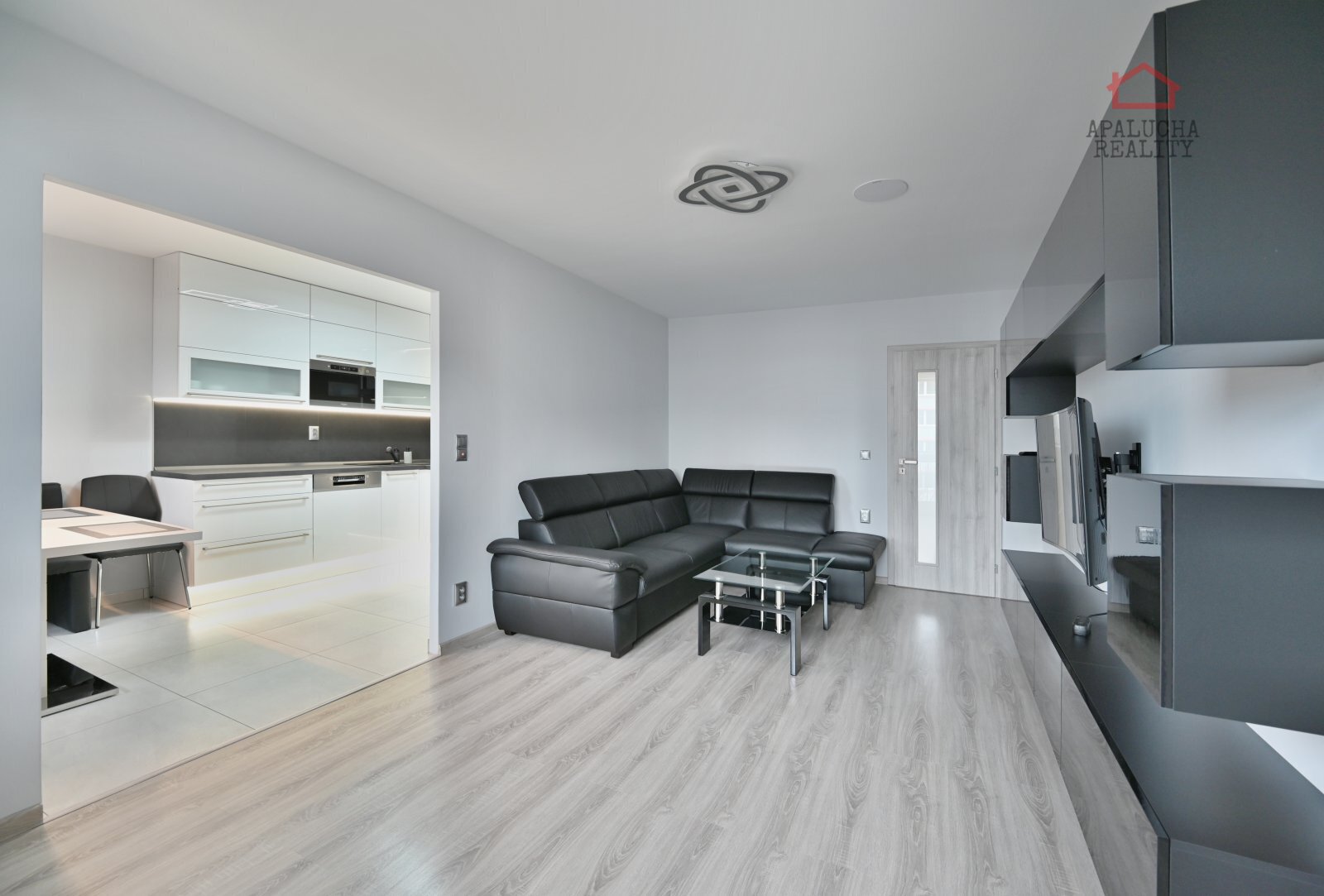 Dále se z předsíně vstupuje do dvou neprůchozích pokojů. Jeden pokoj slouží jako ložnice, která je vybavena dvojlůžkovou postelí a praktickým pracovním koutem a druhý pokoj je vhodný jako dětský pokoj a je v tuto chvíli nezařízený. Obývací pokoj je vybaven obývací stěnou a rohovou koženou sedací soupravou, která dodává místnosti elegantní vzhled. Na obývací pokoj navazuje kuchyň s moderní kuchyňskou linkou s LED podsvícením a vestavěnými spotřebiči a lednicí. Součástí kuchyně je jídelní stůl s další rohové posezení, které vytváří příjemný prostor pro stolování.
