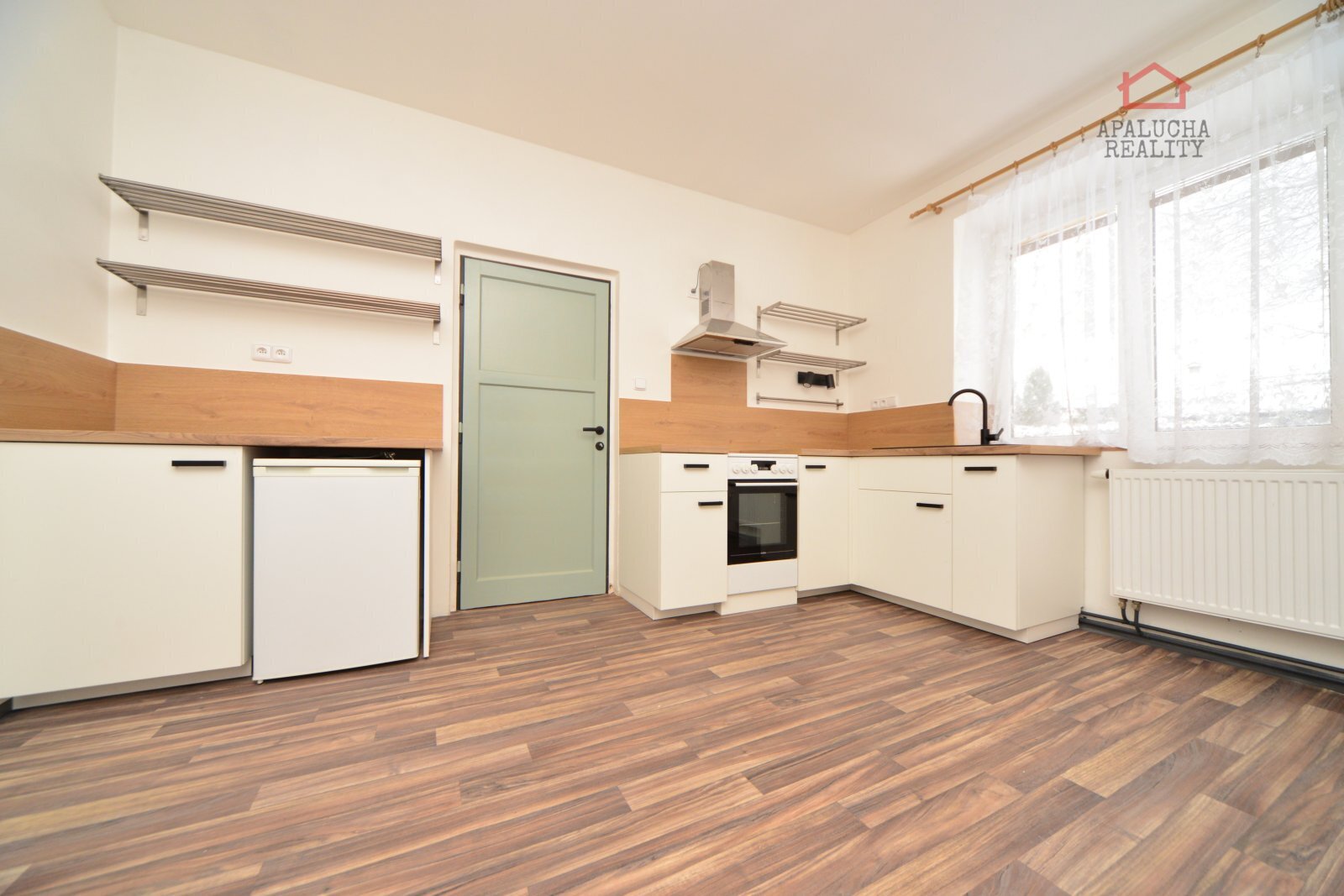 APALUCHA REALITY Vám exkluzivně nabízí k pronájmu byt 1+1 v ulici Tyršova v klidném prostředí ideálním pro rodinný život. Disponuje obytnou plochou 48,20 m2 a náleží k němu zděná kóje 11,70 m2. Nachází se v přízemí. Z předsíně (5,2 m2) je vchod do koupelny s novým sprchovým koutem a WC (4 m2). Po pravé straně je kuchyně s komorou (17 m2), dále obývací pokoj (18 m2) a za ním malý dětský pokoj či pracovna nebo šatna (4 m2). Byt je částečně vybaven kuchyňskou linkou se sporákem a digestoří, dále lednicí a skříňkou na potraviny. K dispozici jsou šatní skříně. Vytápění je zajištěno elektrokotlem s připojením na radiátory, ale je možné i využít kamna na dřevo. Ohřev teplé vody bojlerem. PENB G.